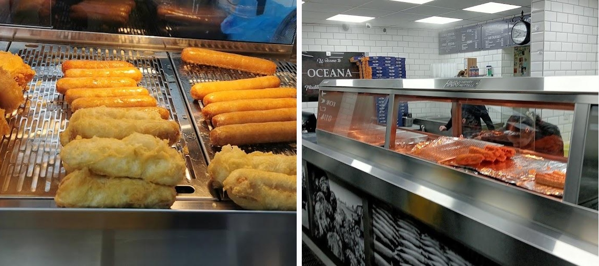 Oceana Fish Bar specializes in fish and chips, offering a variety of options including cod, pies, burgers, and tasty extras like curry sauce and baked beans.